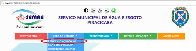 Ao acessar o site do SEMAE, vá ao menu superior e opte por "área do usuário":Em seguida, escolha a opção "Faturas - Segunda Via":